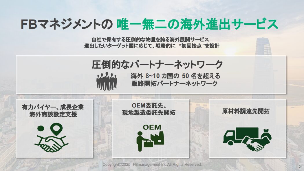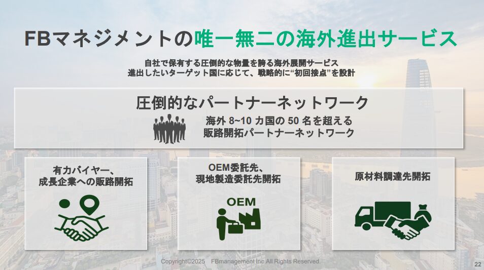 海外、特にASEAN諸国でネットワークを構築しており、タイ、ベトナム、カンボジア、インドネシアなどの現地各国で実業展開している起業家をカントリーパートナーとして契約させていただき、最新の情報、上質なネットワークを地方有力企業様に提供できるのが大きな強みになっています。