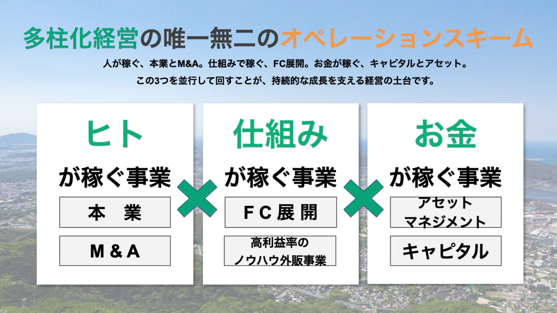 地方には素晴らしい本業を持つ企業が多くありますが、環境変化に弱いままでは、最低賃金の上昇や市場縮小に耐えきれない未来がきます。 だからこそ、本業(ヒトが稼ぐ事業)に加え、「仕組みで稼ぐ事業(FC展開など)」や「お金が稼ぐ事業(投資・M&A)」を組み合わせ、複数の収益の柱を持つ「多柱化経営」へと進化させる必要があります。